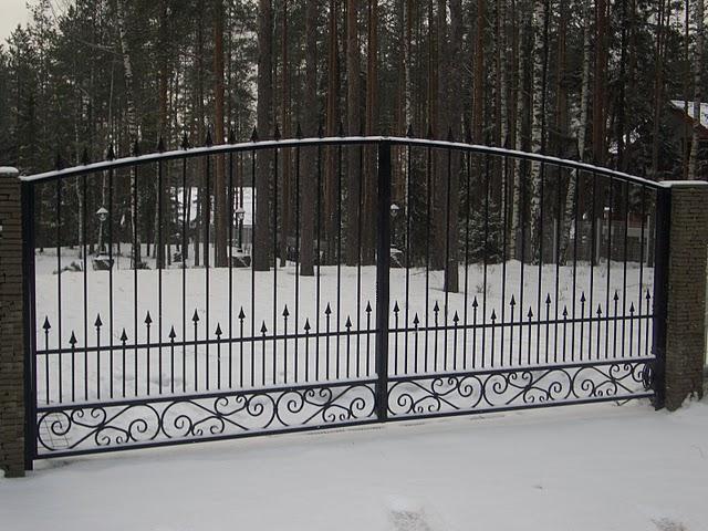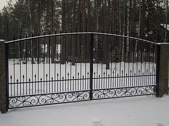 Кованые ворота с декоративным орнаментом по низу и пиками по средней и верхней части. Чаще всего исполняются из квадратного прутка сечением 12, 14, 16мм, рама ворот из трубы профильной 40х40 и выше.