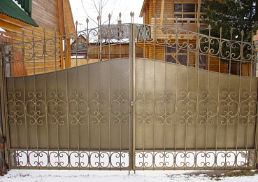 Можем изготовить любые ворота под ваши размеры. Мы индивидуально подходим к каждому клиенту в дизайне. Предлагаем широкий выбор элементов художественной ковки для создания единственного в своем экземпляре орнамента. Кованые ворота частично зашитые металлическим листом с полимерным покрытием по каталогу RAL.