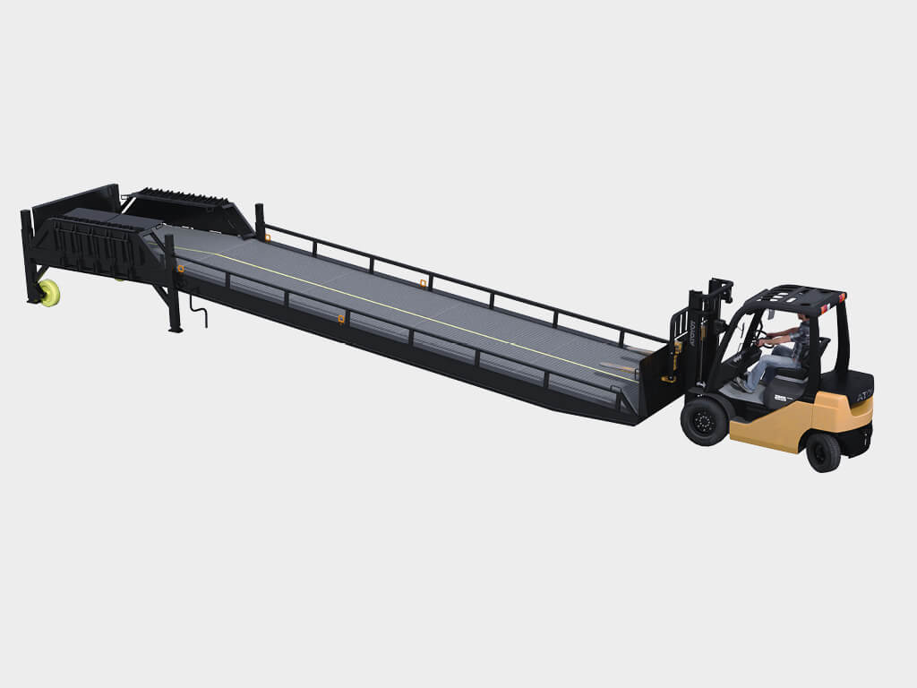 Мобильные рампы DoorHan предназначены для обеспечения доступа автопогрузчика с поверхности земли в кузов автомобиля. Они не требуют специальной подготовки для запуска, позволяя проводить погрузочно-разгрузочные работы, не прибегая к строительству стационарной рампы. Все рампы имеют схожий принцип работы. Рампа поднимается при помощи механического или гидравлического привода, оборудованного системой безопасности, и перемещается погрузчиком к автомобилю. Рампа с опорой на кузов автомобиля ложится на кузов, рампа с собственными опорами устанавливается на опоры. После окончания работ рампа поднимается и с помощью погрузчика транспортируется к месту хранения.