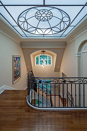 Особенность данного лестничного ограждения это использование в кованом орнаменте декоративных штампованных и литых элементов.