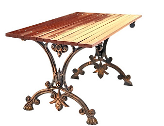 Стол чугунный "Аллея" длиной 1,5 метра Материалы: • Опоры: Сталь, порошковая окраска. • Столешница: Брус, изготовленный из хвойных пород древесины класса "А". Покрыты антисептическими пропитками, тонировкой и яхтным полуматовым лаком в 2 слоя. • Стол оснащен дополнительным усилением от раскачивания. • Изделие пригодно для использования во всесезонных атмосферных условиях.
