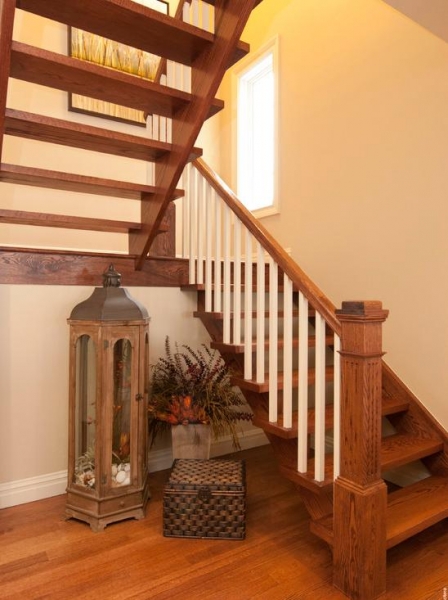 Деревянная лестница из массива древесины твердых пород без подступенков. Незамысловатое ограждение лестницы придает ей лаконичность и позволяет сочетать ее с любым интерьером вашего дома.